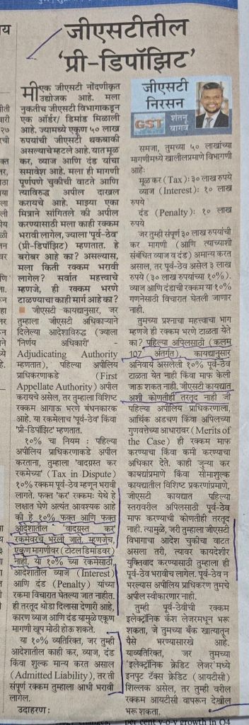 GST– first Appellate procedure –10% deposit of tax demanded is must [2] but interest and fine excluded while calculating 10% — Courtesy Sakal