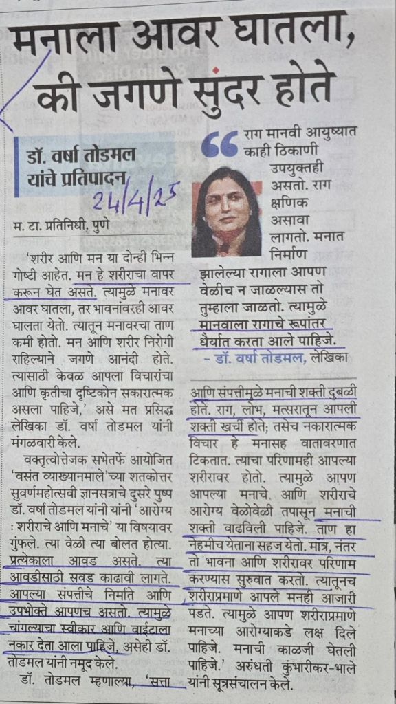 डॉक्टर वर्षा तोडमल — लेखिका–यांनी केलेले विश्लेषण उपयुक्त आहेच पण मला आवडलेले वाक्य — ” सत्ता आणि संपत्तीमुळे मनाची शक्ति दुबळी होते ” — सौजन्य महाराष्ट्र टाइम्स