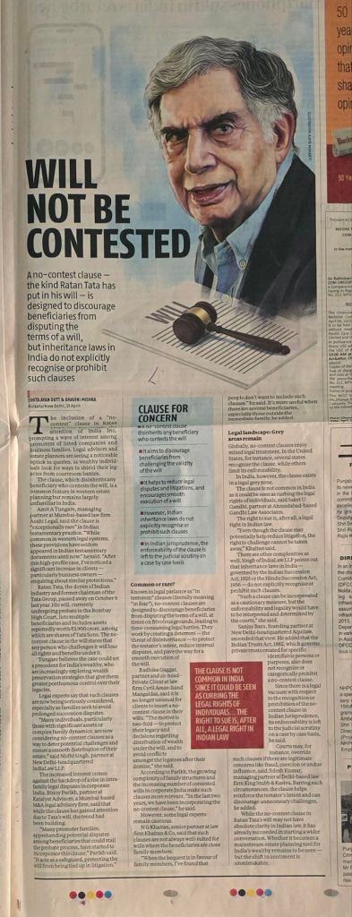 A no contest clause – the kind Ratan Tata has put in his will– is designed to discourage beneficiaries from disputing the terms of a will, but inheritance laws in India do not explicitly recognize or prohibit such clauses — Courtesy Business Standard