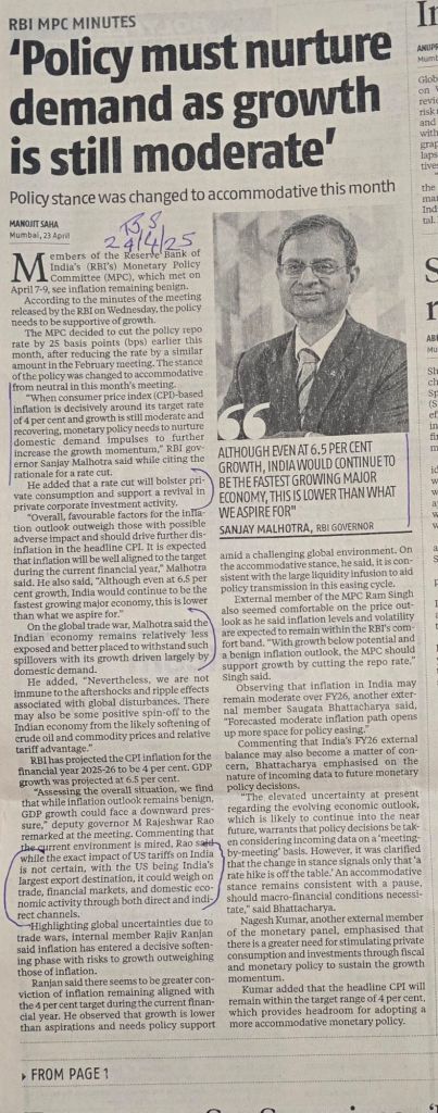 Guv RBI– feels [ latest MPC meet ] demand needs to be given a push now that inflation is firmly under control– [2] feels though GDP growth 6.5% is still the highest in the world, there is scope for further improvement and to do this, rate cut is one of the tools–Courtesy Business Standard