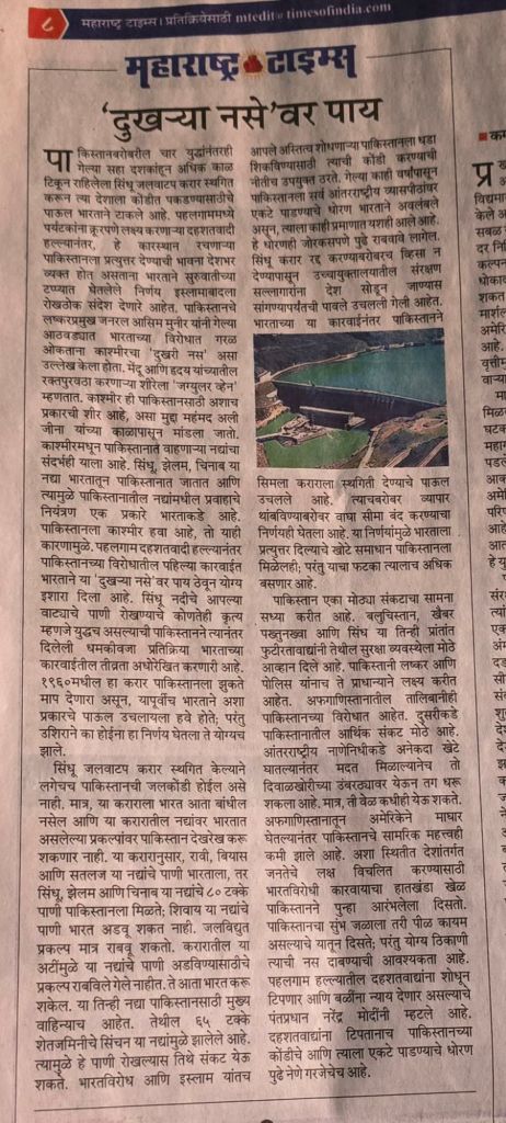 मटा अग्रलेख – भारताने सिंधू जलवाटप करार स्थगित करून पाकिस्तानला कोंडीत पकडण्यासाठी महत्त्वाचे पाऊल उचलले आहे [2] कराराप्रमाणे सिंधू-झेलम- चिनाब या नद्यांचे 80% पाणी पाकिस्तानला मिळते व करारानुसार भारत हे पाणी अडवू शकत नव्हता — या तिन्ही नद्या पाकिस्तानसाठी मुख्य वाहिन्यांच आहेत– तेथील 65% शेतजमिनीचे सिंचन या नद्यामुळे झालेले आहे–[3] करार स्थगित केल्यामुळे पाकिस्तानमध्ये संकट ओढवू शकते– [4] भारताने उचललेले पाऊल पाकिस्तानला कोंडीत पकडण्यासाठी फार उपयुक्त ठरणार आहे–