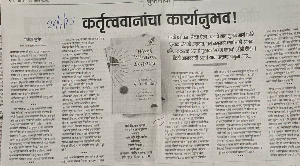 Work – Wisdom- Legacy ह्या पुस्तकाचे परीक्षण श्री गिरीश कुबेर यांनी केले आहे [2] पुस्तक जेव्हढे वाचनीय आहे तेव्हढाच श्री कुबेर यांचा लेख देखील वाचनीय आहे — [3] हा लेख वाचून मला पुस्तक घ्यावेसे वाटले- [4] रिझर्व्ह बॅंक निवृत्त गव्हर्नर श्री रेड्डी यांची प्रस्तावना हे एक आकर्षण–