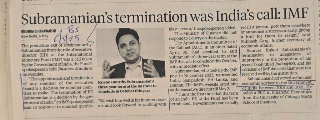 Abrupt end ? Reason – [a] allegations of impropriety in the promotion of his recent book titled India@100 [b] his criticism of IMF data sets that were not received well by the institution- Courtesy Business Standard