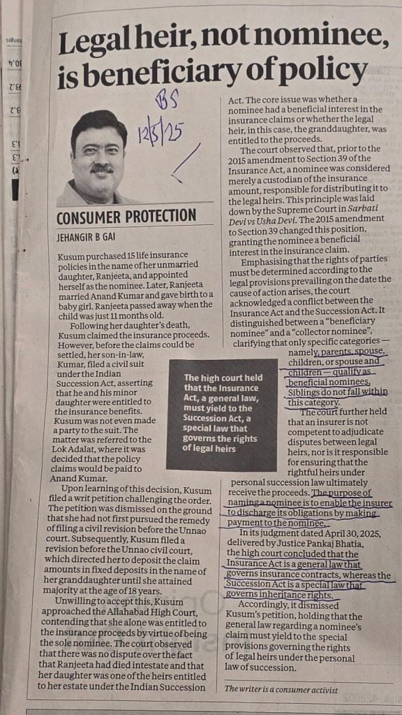 Insurance Act [ which governs insurance contracts ] is a General law which should yield to Special law [ Succession Act ] — Courtesy Business Standard