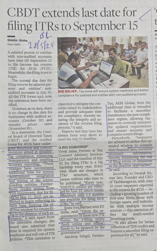 Individuals [mostly] get additional time to submit ITRs– upto 15.9.25 — Courtesy BusinessLine