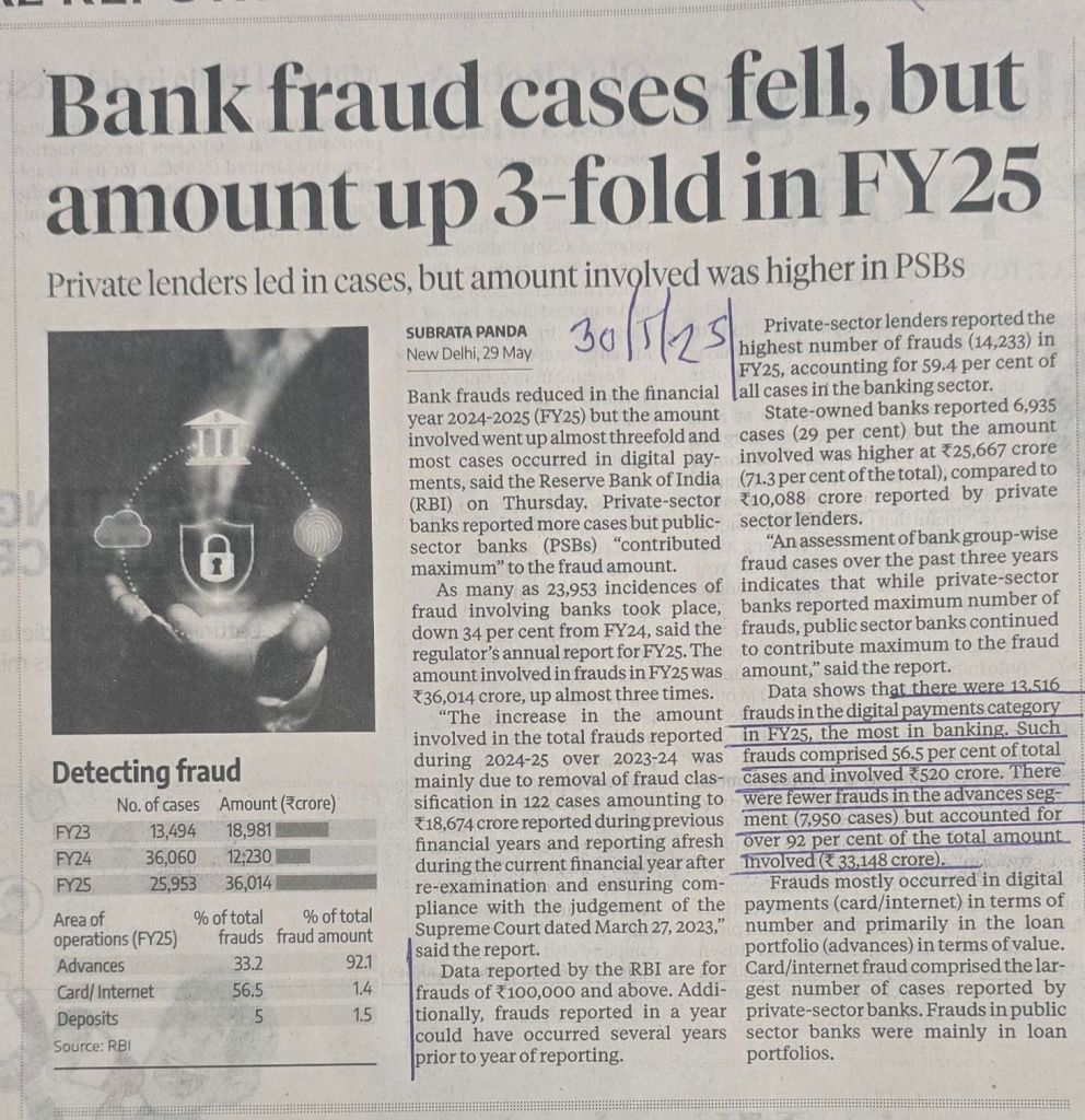 Card / Internet fraud numbers are up [ 56% of total number] but amount wise fraud cases [ Advances ] constitute 92% [2] Point to be noted– data are for frauds of Rs.100000 and above — Courtesy Business Standard