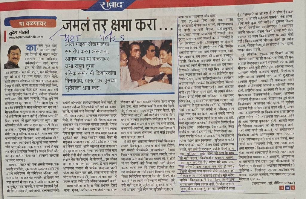 सुदेश भोसले यांची किशोर कुमार यांच्या बाबतची आठवण– सौजन्य महाराष्ट्र टाइम्स