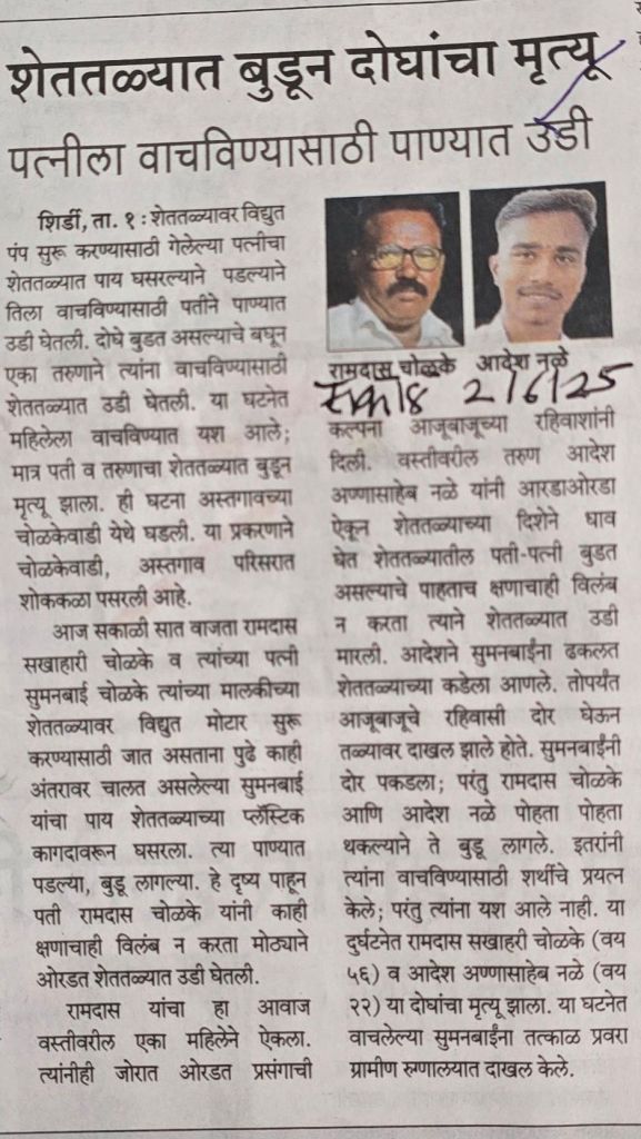 पत्नीला वाचवण्यासाठी नवर्याने प्रयत्न केले– नवरा व बायको बुडत असल्याचे पाहून 22 वर्षीय तरुणाने — श्री आदेश नळे –प्रयत्न केले [2] बायको वाचली पण नवरा व श्री आदेश नळे मात्र स्वतःला वाचवू शकले नाहीत– सौजन्य सकाळ