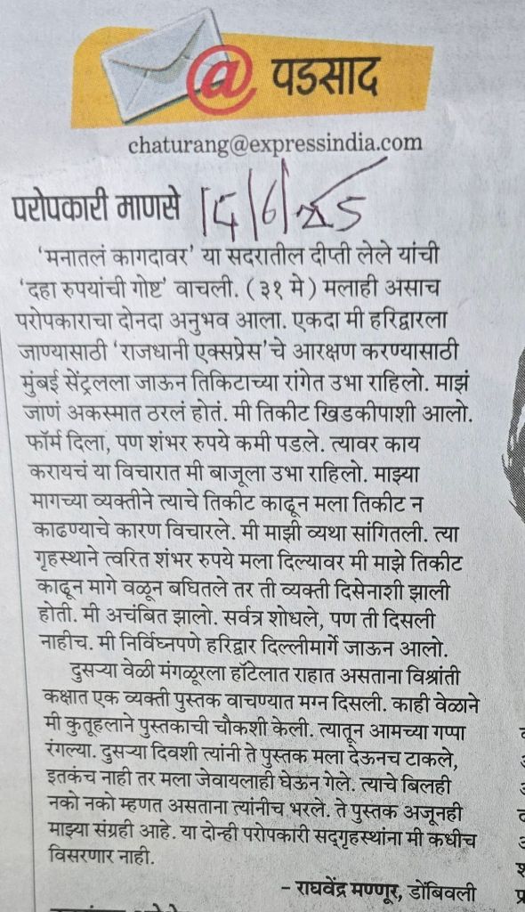 अशीही –दुसऱ्यांना उत्स्फूर्तपणे मदत करणारी– माणसे भेटतात! हे प्रसंग लक्षात ठेऊन इतरांना सांगणे देखील तेव्हढेच महत्त्वाचे! सौजन्य चतुरंग [लोकसत्ता]