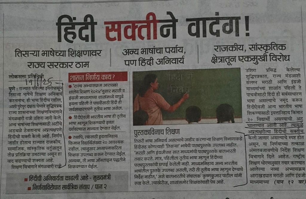 लोकसत्ता मधील बातमी– हिंदी/तिसरी भाषा याबाबतीतील– 19.6.25