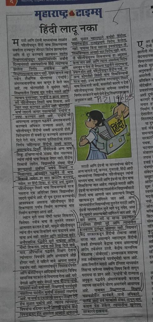 हिंदीची सक्ती का नको– याबाबतचा महाराष्ट्र टाइम्स चा अग्रलेख वाचण्यासारखा– 19.6.25