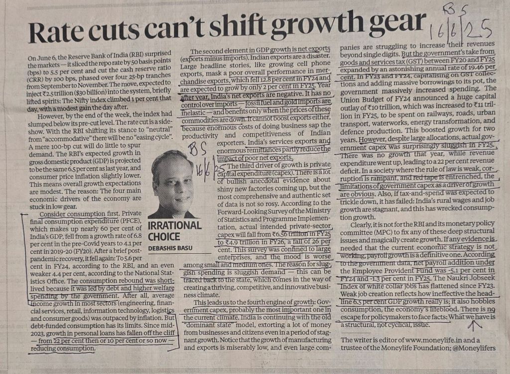 *******Article by Mr Debashis Basu–Rate cuts will prove ineffective — why ? – Courtesy BS