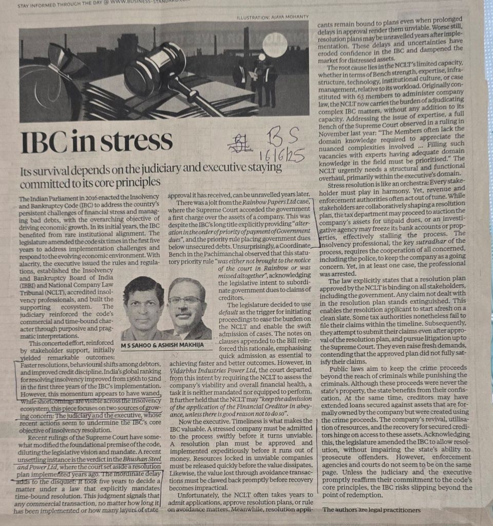 *******Article by Ex Chief of IBBI–tries to lay blame Courts and ….. Courtesy BS