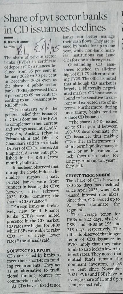 CDs [1] all time high 11.75 lakh crore during FY 25 [2] CDs issued upto 91 days and between 180-365 days dominate the CD issuance– Courtesy BusinessLine
