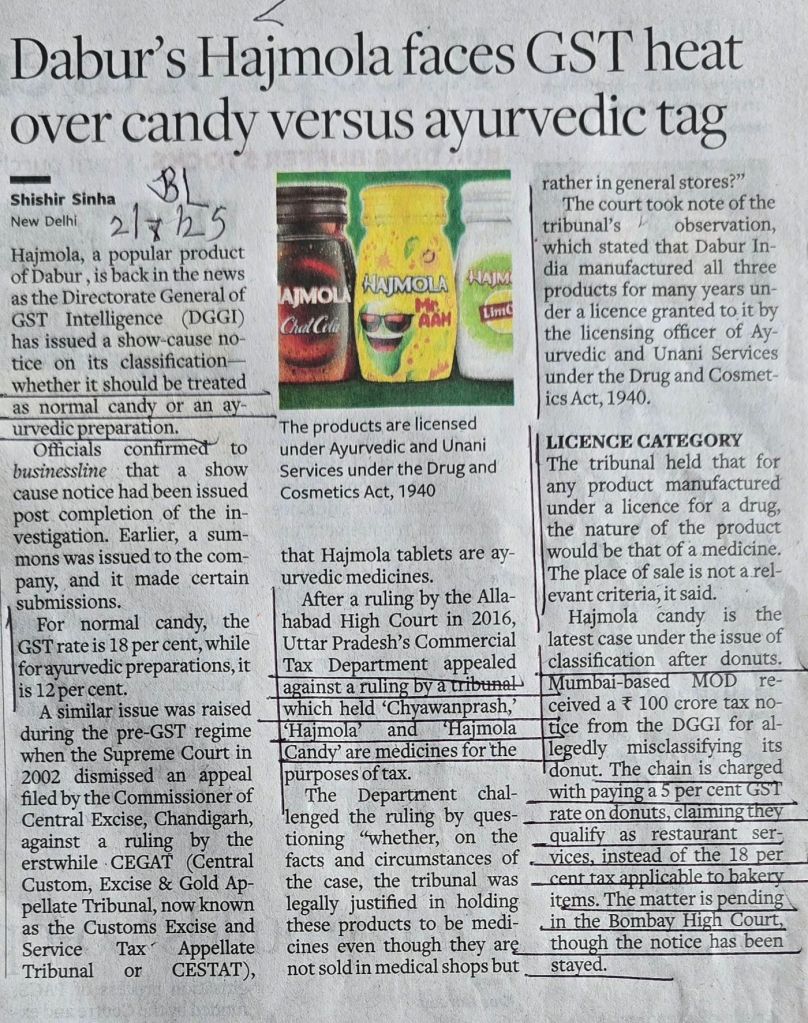 Rate war — Hajmola case — Normal Candy is charged GST 18% where as for Ayurvedic preparations it is 12% [2] Show Cause is issued [3] Earlier case — closely resembling was –donuts — Courtesy BusinessLine