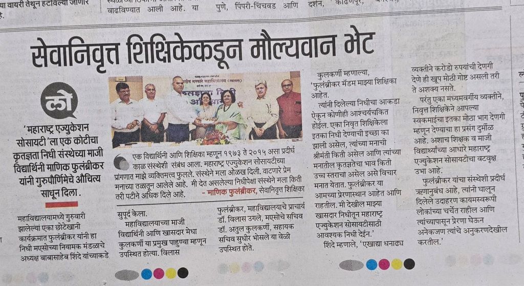 An unparalleled gesture by a teacher– where she was also a student–donation of 1 crore — Courtesy Loksatta