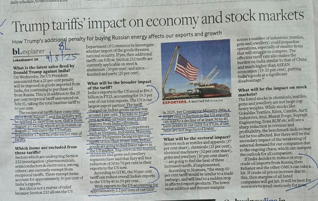 Article reveals [1] US is the largest buyer $ 86.5 — accounting for 19.5% of our total exports [2] Earlier tariff was just around 3% [3] Exports to US were 2.2% of GDP in 2025 [4] GDP will take a hit of 30 to 40 basis points in our GDP [5] 50% tariff will reduce exports to USA by about 50% [6] sectors being hit — textiles and apparels- chemicals- electrical machinery- gems and jewellery [7] and if at all India is forced to stop buying oil from Russia, then Reliance will take a hit and due to enhanced cost of oil– sourced from Russian markets–margins of listed companies will get a hit– Courtesy BusinessLine