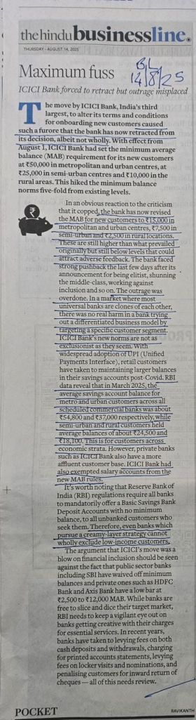 ICICI Bank –MAB–BL Editorial states the outrage was overdone [2] says there was no real harm in a bank trying out a differentiated business model by targeting a specific customer segment [3] That said it also quotes RBI data — ” In March 2025 the average savings account balance for metro and urban customers across all SCB was about 54800 and 37000 respectively ” Source BusinessLine