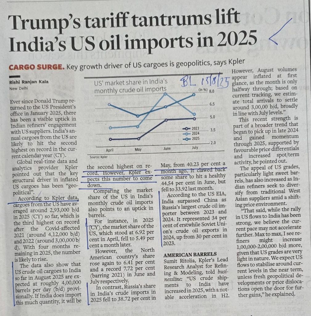 Oil Imports–Russia continues to be a dominant player with 34% — [2] US slowly but surely catching up [ between 5 to 6% ] — Courtesy BusinessLine