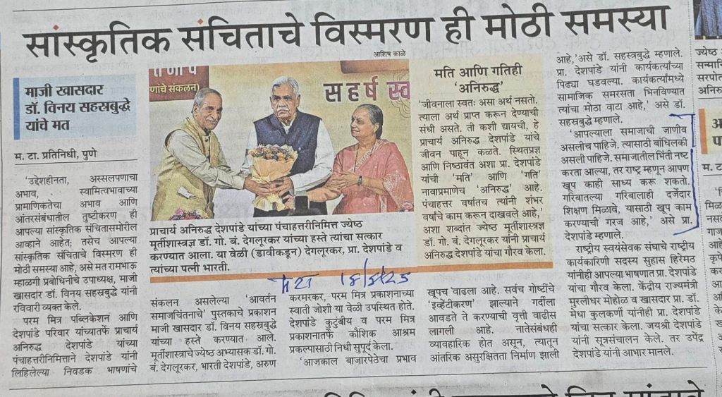 ” आजकाल बाजारपेठेचा प्रभाव खूपच वाढला आहे….. गर्दीला आवडते ते करण्याची वृत्ती वाढली आहे — नातेसंबंधही व्यावहारिक होत असून त्यातून आंतरिक असुरक्षितता निर्माण झाली आहे ” — डॉक्टर सहस्त्रबुद्धे — प्राचार्य अनिरुद्ध देशपांडे यांच्या सत्कारानिमित्त–[2] प्राचार्य देशपांडे यांनी लिहिलेले पुस्तक ” आवर्तन समाज चिंतनाचे ” must buy book ” बातमी सौजन्य महाराष्ट्र टाइम्स