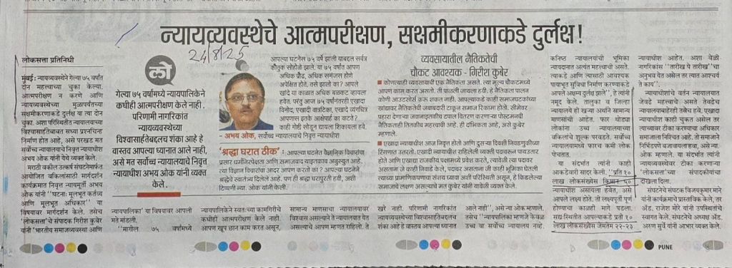गेल्या 75 वर्षामध्ये न्यायपालिकेने कधीही आत्मपरीक्षण केले नाही– परिणामी नागरिकांत न्यायव्यवस्थेच्या विश्वासार्हता बद्दल शंका आहे हे वास्तव आपल्या ध्यानात आले नाही–निवृत्त न्यायमूर्ती [सुप्रीम कोर्ट] श्री अभय ओक यांचे मत- बातमी सौजन्य लोकसत्ता