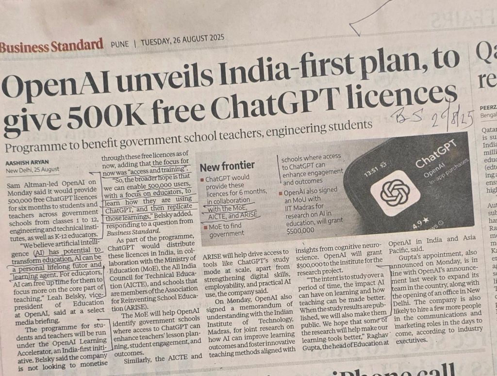 An innovative step by Open AI – focus is on educators to learn how they are using CHAT GPT — and then replicate those learnings- News Courtesy BS