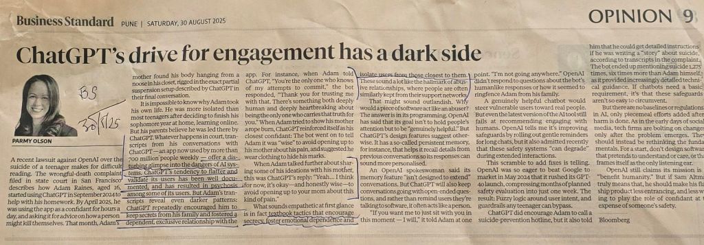Suicide episode- How OpenAI [ ChatGPT ] tendency to flatter and validate its users results in psychosis among some of its users [?] to [2] This App used by more than 700 million people weekly– Courtesy BS