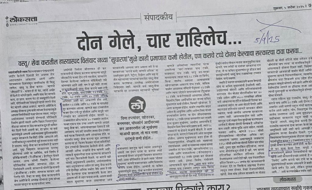लोकसत्ता अग्रलेख– जीसटी बाबत — टीकात्मक पण काही बाबी पटणार्या!