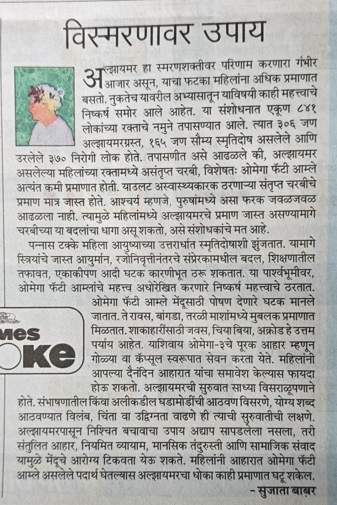 विस्मरण– महिलांसाठी सुचवलेला उपाय –आहारात ओमेगा फॅटी आमले असलेले पदार्थ घेतल्यास धोका काही प्रमाणात घटू शकेल –सौजन्य महाराष्ट्र टाइम्स 22.9.25