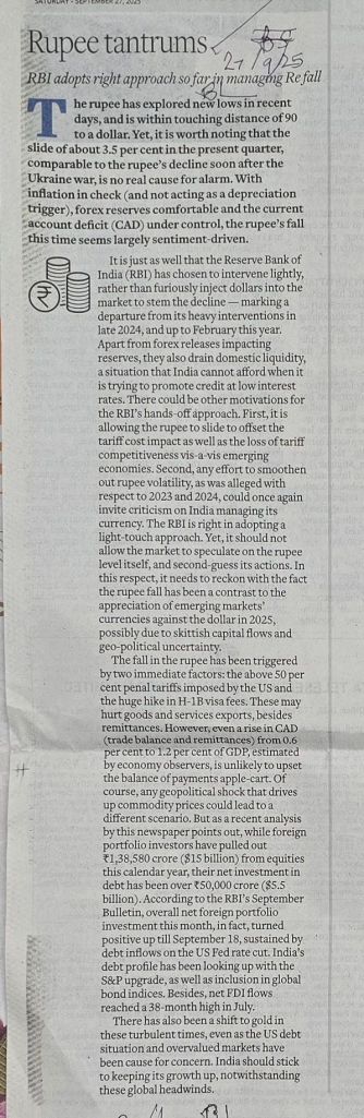 ***The fall in the rupee has been triggered by two immediate factors: the above 50 per cent penal tariffs imposed by the US and the huge hike in H-1B visa fees. These may hurt goods and services exports, besides remittances. However, even a rise in CAD from 0.6 per cent to 1.2 per cent of GDP, estimated by economy observers, is unlikely to upset the balance of payments apple-cart–BL