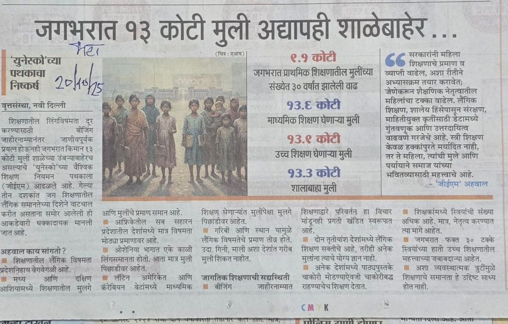 सर्वांगीण प्रगती होण्यासाठी जास्तीत जास्त मुलींना शैक्षणिक सुविधा उपलब्ध करून दिल्या पाहिजेत — वाचनीय संदर्भ- महाराष्ट्र टाइम्स मधील बातमी
