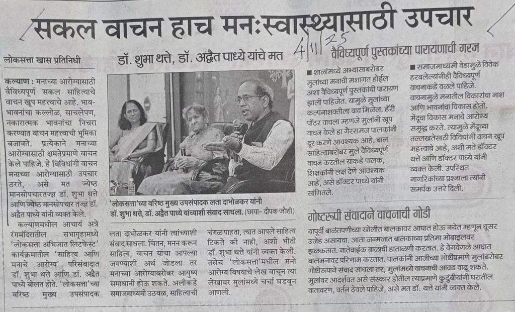 ज्येष्ठ मानसोपचारतज्ज्ञ डॉक्टर शुभा थत्ते आणि डॉक्टर अद्वैत पाध्ये–” मनाच्या आरोग्यासाठी वाचन [ तेही वैविध्यपूर्ण सकल साहित्य ] का महत्त्वाचे आहे ? सौजन्य लोकसत्ता– [ अधोरेखित केलेले विशेष लक्ष देण्यासारखे ]
