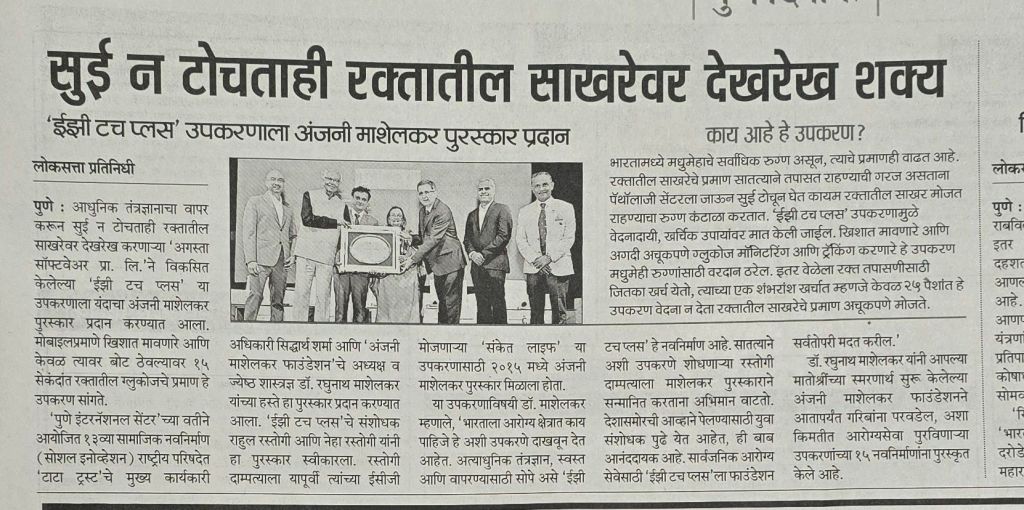रक्तातील साखर मोजणे आता किती सोपे ! Easy Touch Plus [2] डॉक्टर रघुनाथ माशेलकर यांनी आपल्या मातोश्रींच्या स्मरणार्थ सुरू केलेल्या अंजनी माशेलकर फाऊंडेशनने आतापर्यंत गरिबांना परवडेल अशा किमतीत आरोग्यसेवा पुरवणाऱ्या उपकरणांच्या 15 नवनिर्माणाना पुरस्कृत केले आहे– बातमी सौजन्य