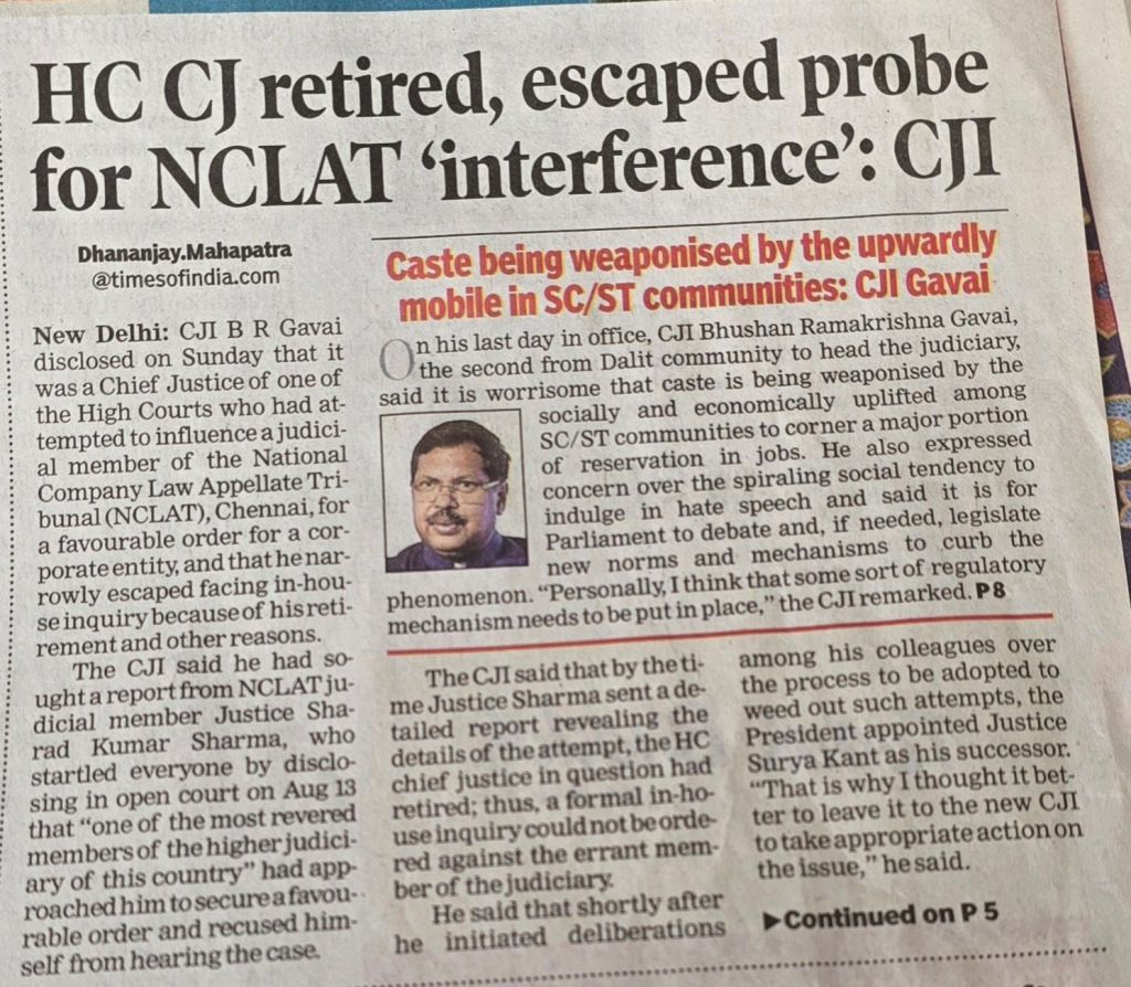 CJI BR Gavai disclosed on Sunday that it was a Chief Justice of one of the High Courts who had attempted to influence a judicial member of NCLAT Chennai for a favorable order for a corporate entity [2] and that he narrowly escaped facing in-house inquiry because of his retirement and other reasons. — Courtesy ToI