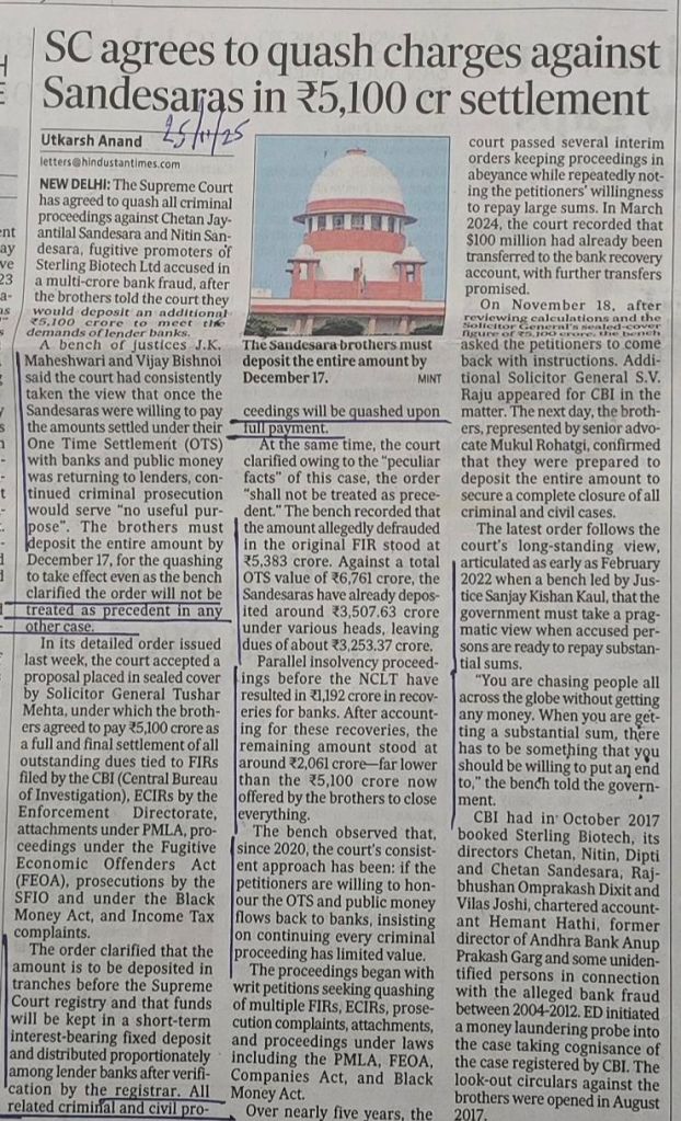 SC said ” the court had consistently taken a view that once the Sandesaras were willing to pay the amounts settled under their OTS 6761 crored with banks and public money was returning to lenders , continued criminal prosecution would serve ” no useful purpose ” [2] The bench clarified owing to the ” peculiar facts ” of thus case the order ” shall not be treated as precedent ” the order would not be treated as precedent in any other case. [3] amount allegedly defrauded in the original FIR stood at 5383 crore (4] Parallel insolvency proceedings before nclt have resulted in recovery of 1192 crores for banks [5] remaining amount stood at around 2061 far lower than 5100 now offered by the brothers to close everything [6]