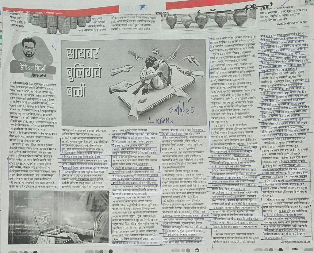 किशोरवयीन मुले बळी पडत आहेत– आणि महत्त्वाचे म्हणजे पालकांच्या कडे ह्या बाबत बोलतही नाहीत– याचे एक कारण– मोबाईल काढून घेतला जाईल आणि त्यामुळे समवयस्क मित्र / मैत्रिणी मध्ये बदनामी/ हेटाळणी होईल अशी भीती देखील असते [2] या सर्व बाबतीत आई/ वडिलांनी- पालकांनी कसे वागले पाहिजे ते समजून घेण्यासारखे आहे– लेख सौजन्य – लोकसत्ता 28.11.25