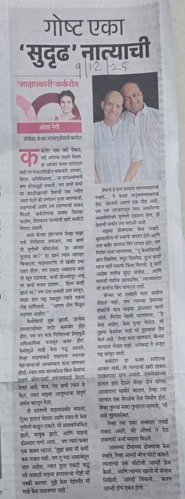 This is the photo of a couple that appeared in Sakal today. [2] The wife went through agonies because of chemotherapy side effects [3] She started losing her hairs — [4] Husband — true to his love for his wife — cut his hair and vowed not to grow until she comes out of her travails [5] Husband’s love acted stronger than medicine [6] The article ends with an assertion that ” आम्ही जिंकलो– कारण आम्ही दोघे एकत्र होतो “