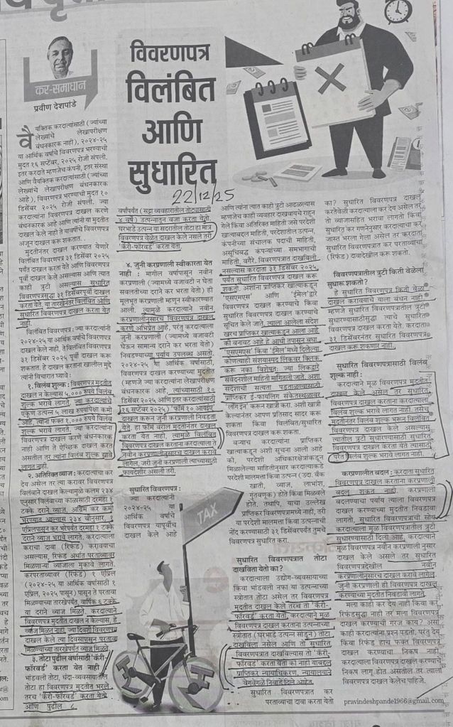 विवरणपत्र– विलंबित आणि सुधारित — CA श्री प्रविण देशपांडे यांचा लेख–लोकसत्ता 22.12.25
