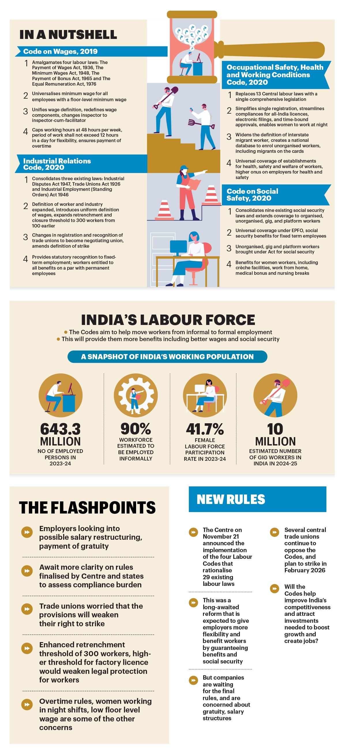 Significantly, the decision to finally implement the Codes comes at a time when Indian goods face a stiff tariff of 50% from the US, which is disrupting most labour-intensive export sectors and micro, small and medium enterprises. This has raised worries of a possible slowdown of economic growth.