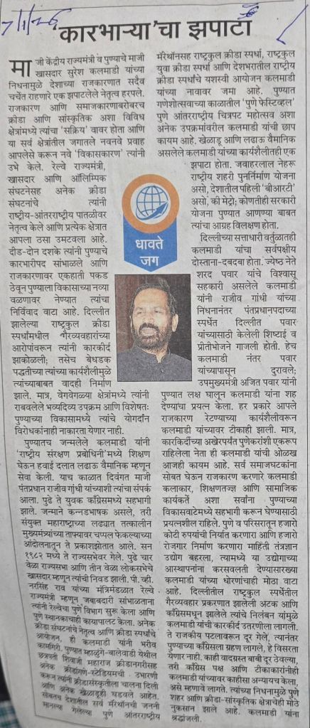 पुण्यातील पूर्व खासदार दिवंगत श्री कलमाडी यांच्या बाबतचे विवेचन — सौजन्य महाराष्ट्र टाइम्स