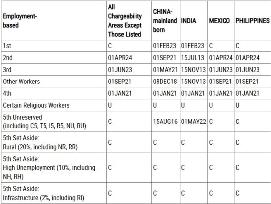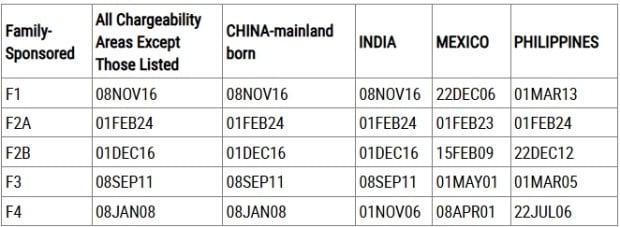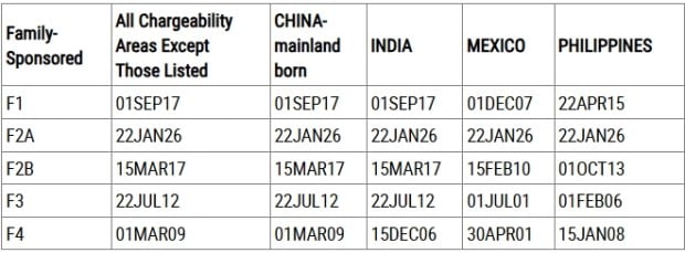 The “Final Action Dates” or “Dates for Filing” are used by USCIS to determine whether applicants who are already residents of the United States should submit their “adjustment of status” applications each month. The “Dates for Filing” table for both family-based and employment-based categories must be followed by applicants in February.