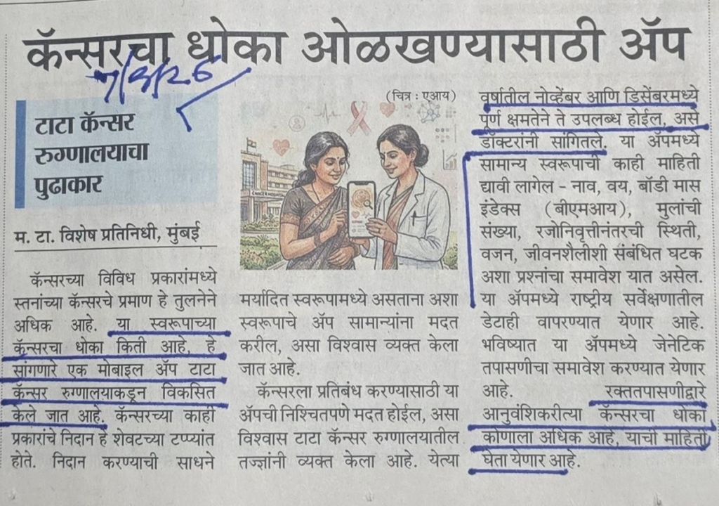 टाटा कॅन्सर रुग्णालयाच्या पुढाकाराने एक ॲप विकसित होत आहे–[2] नोव्हेंबर- डिसेंबर पर्यंत पूर्ण विकसित झाले असेल [3] रक्ततपासणी द्वारे आनुवंशिक कॅन्सरचा धोका कोणाला अधिक आहे याची देखील माहिती घेता येणार आहे– बातमी सौजन्य महाराष्ट्र टाइम्स