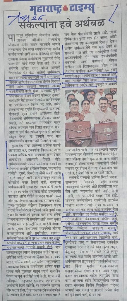 महाराष्ट्र सरकारचा अर्थसंकल्प [1] विकासदर 7.9% — याबाबत देशात आघाडीवर [2] पुढील मार्गक्रमणा कशी करणार तर — चार स्तंभ जे फार महत्त्वाचेआहेत–[a] प्रगतीशील–[b] शाश्वत– [c] सर्वसमावेशक–[d] सुशासन– बातमी सौजन्य अग्रलेख महाराष्ट्र टाइम्स