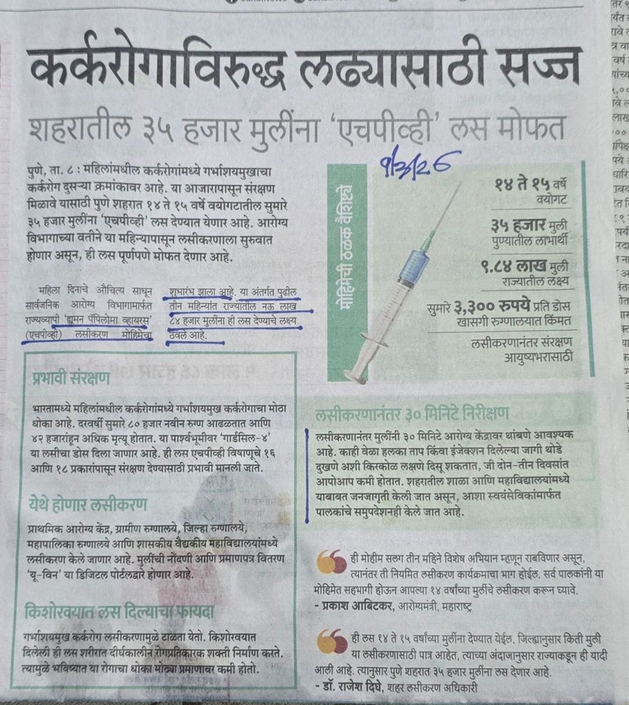 लढाई– कर्करोगा विरुद्ध — 35 हजार मुलींना HPV लस– [2] ह्या उपाया मुळे वेळीच उपाय केले जातील अणि संकटाची तीव्रता कमी होईल. [3] या उपक्रमाबद्दल सरकारचे अभिनंदन– बातमी सौजन्य सकाळ