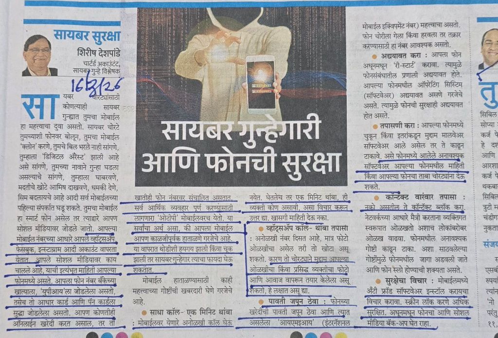 सायबर गुन्हे– काळजी बाबत या क्षेत्रातील तज्ज्ञ श्री शिरीष देशपांडे — जे चार्टर्ड अकाऊंटंट देखील आहेत—यांचा उपयुक्त लेख–बातमी सौजन्य सकाळ