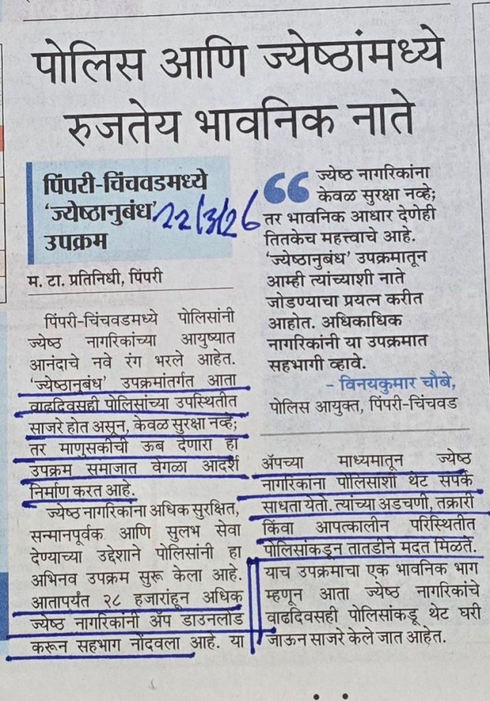 ” ज्येष्ठांनुबंध ” पिंपरी चिंचवड पोलिसांचा अनोखा उपक्रम–दाद देण्यासारखा– 28000 ज्येष्ठ नागरिकांनी एप डाऊनलोड केले आहे. [2] या उपक्रमाचे महत्व समजण्यासाठी–संपूर्ण बातमी वाचणे गरजेचे [3] बातमी सौजन्य महाराष्ट्र टाइम्स
