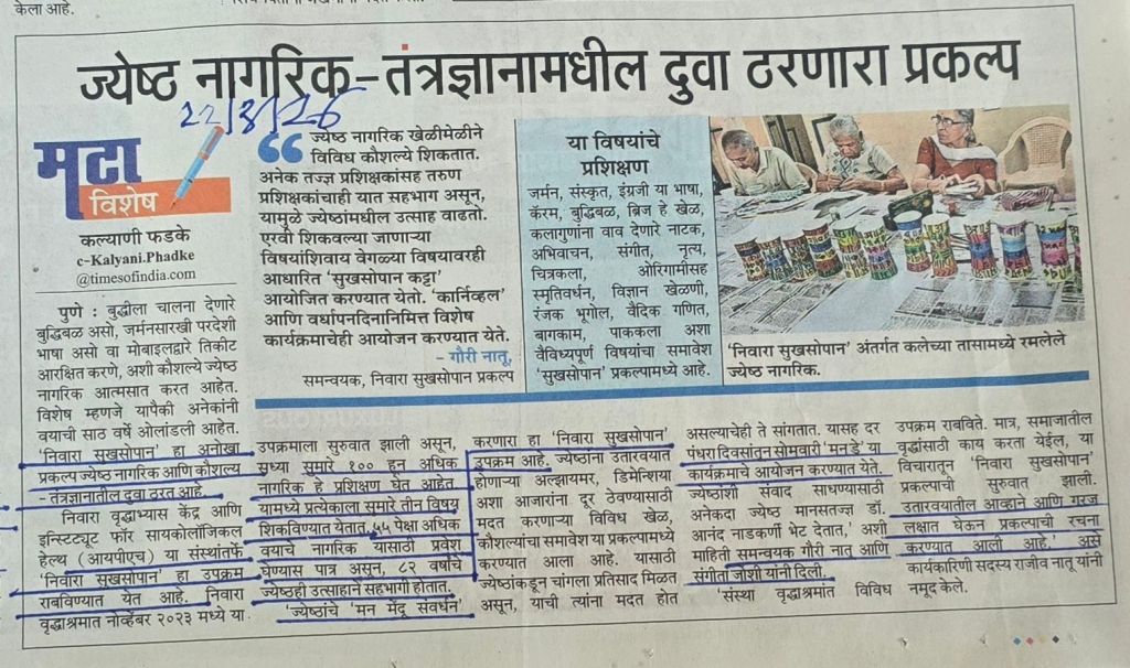 ” निवारा सुख सोपान ” हा प्रकल्प–अवश्य नोंद घ्यावा असा [2] Institute for psychological health — ही संस्था निवारा या वृद्धाश्रमात 2023 नोव्हेंबर पासून कार्यरत आहे. [3] 100 हून अधिक नागरिक– 55 वर्षे आणि अधिक वयाचे — प्रशिक्षण घेत आहेत.[4]प्रत्येकाला तीन विषय शिकवण्यात येतात. [5] बातमी सौजन्य महाराष्ट्र टाइम्स