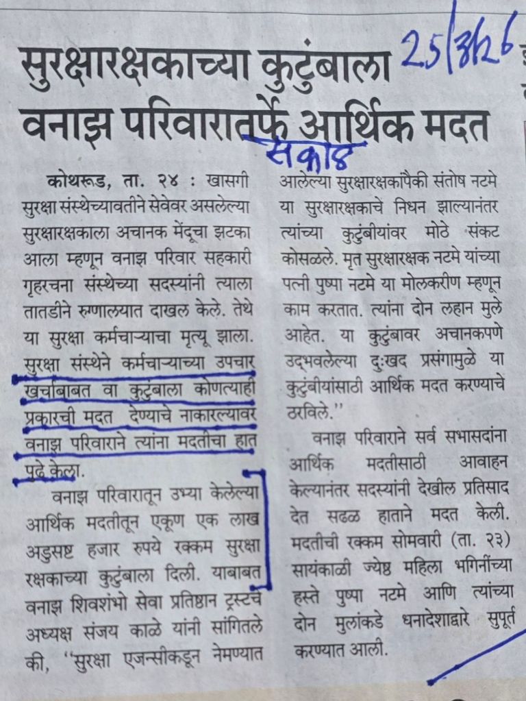 सुरक्षारक्षक कामावर असताना मृत्यू पावला [2] सुरक्षा संस्थेने मदत करण्याचे नाकारल्याने– हाऊसिंग सोसायटी [ वनाझ परिवार] मदतीस धावली–1.68 लाख रक्कम सभासदांकडून जमा करून दिली. बातमी सौजन्य सकाळ