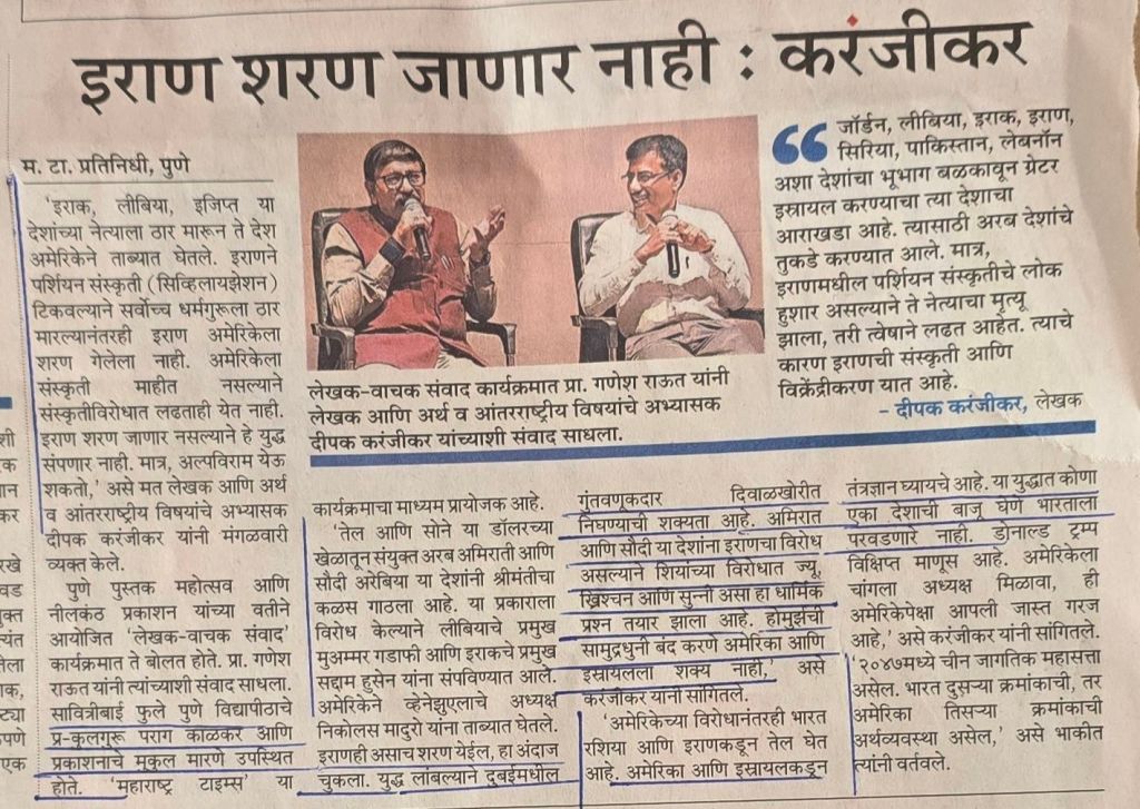 श्री दीपक करंजीकर — अर्थ आणि आंतरराष्ट्रीय विषयांचे अभ्यासक– म्हणतात ” इराण शरण जाणार नाही [2] भारताला कुणा एकाची बाजू घेणे परवडणारे नाही [3] 2047 साली भारत दुसर्या क्रमांकाची अर्थव्यवस्था असेल– चीन पहिल्या क्रमांकाची तर अमेरिका तिसर्या क्रमांकाची– बातमी सौजन्य महाराष्ट्र टाइम्स–