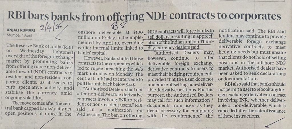 RBI ban on NDF contracts to corporates [both residents and non residents] –[2] BS feels it will force banks to sell dollars — resulting in appreciation of rupee today. News Courtesy BS
